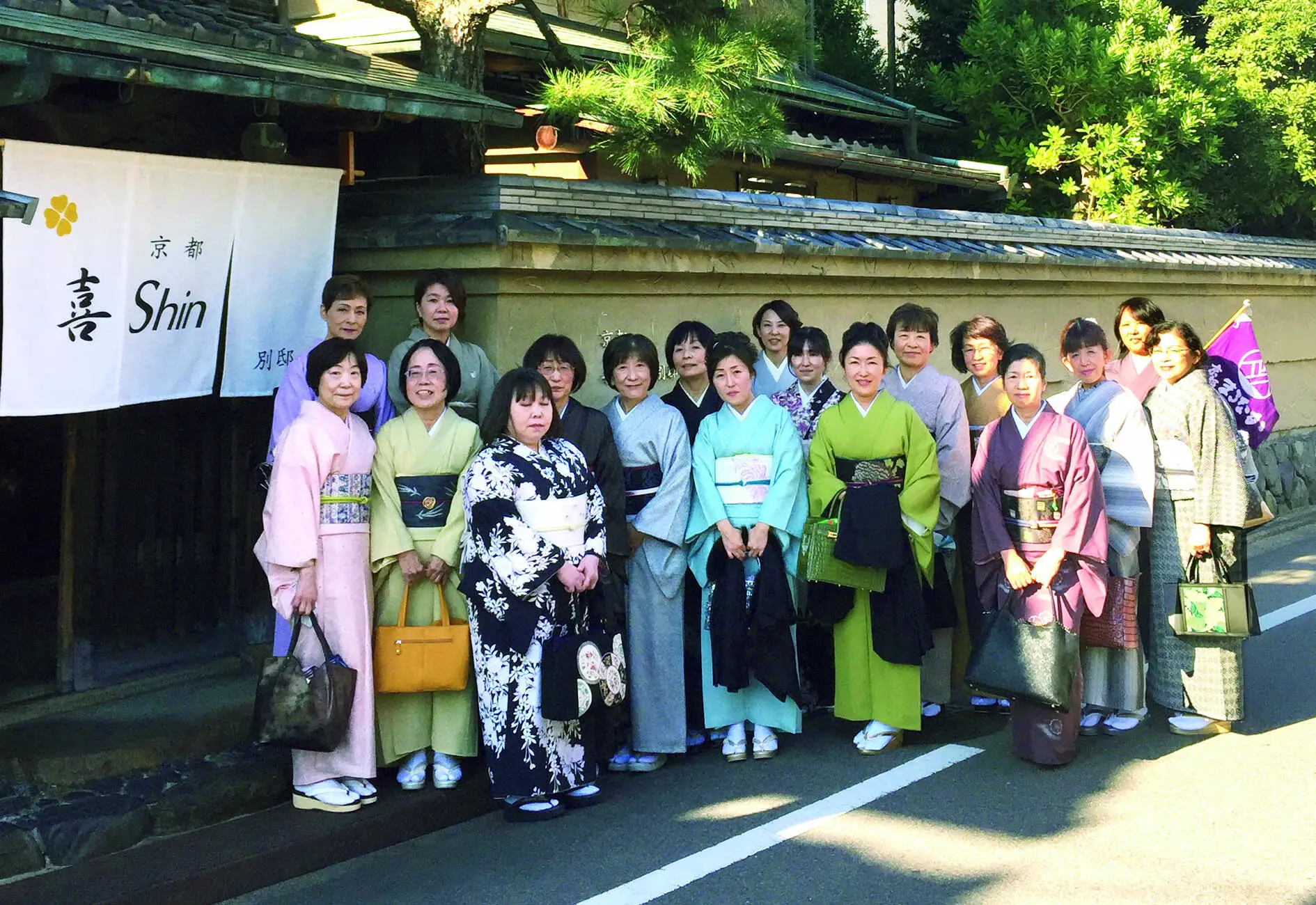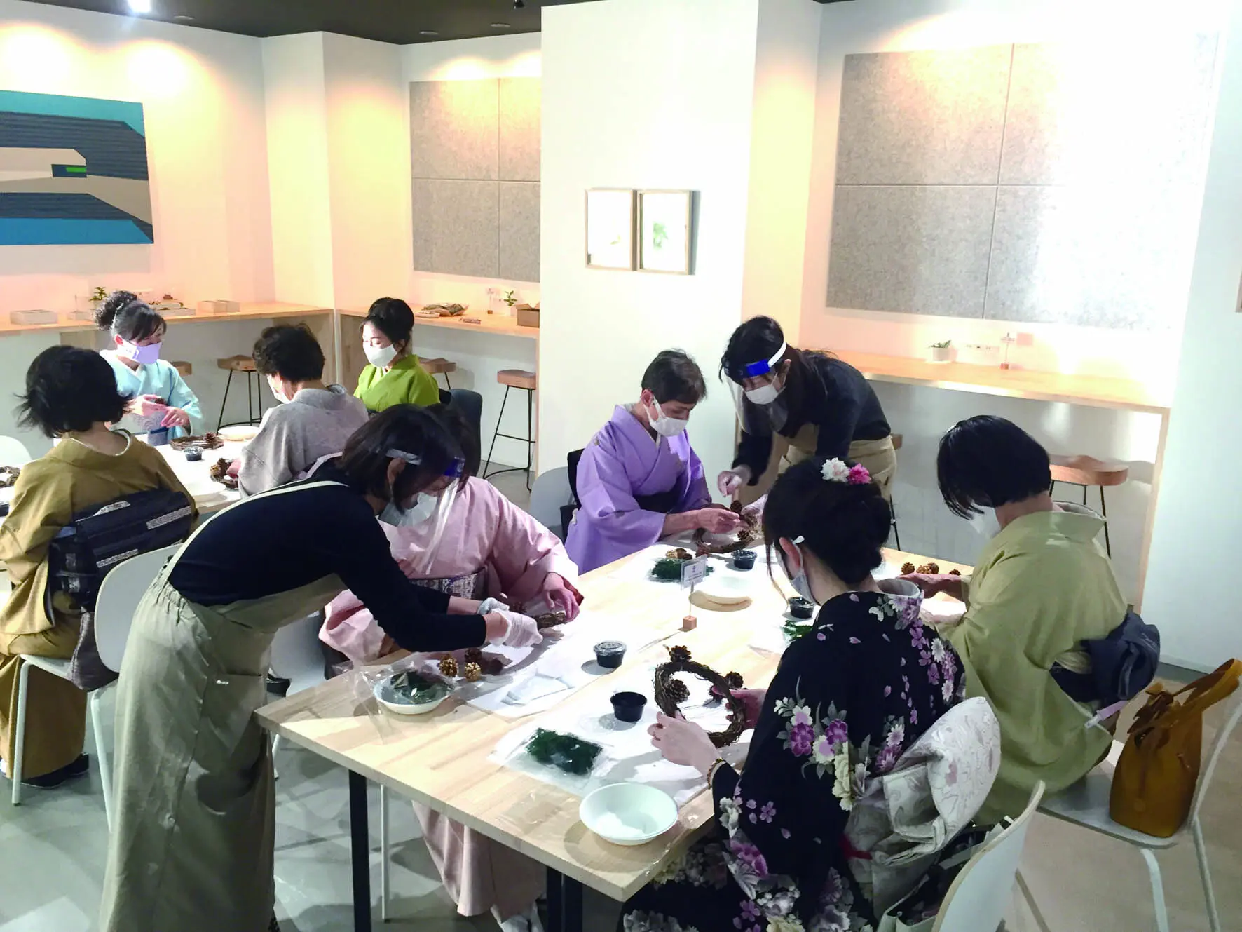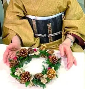 昨年の12月6日に、きものを着て楽しむイベント「舞夢倶楽部」を開催。168 回目となる今回は、「クリスマスプリザーブドフラワー作り」と京懐石フレンチのお店『京都喜Shin』でのランチ会を行いました。クリスマスリース作りでは、個性を生かした素敵なリースが出来上がり、 お互いの感想を言い合いながら楽しく盛り上がりました。その後は金閣寺の前にある町家レストラン『京都 喜Shin』で、ため息が出るほど美しくおいしいお食事をいただきました。