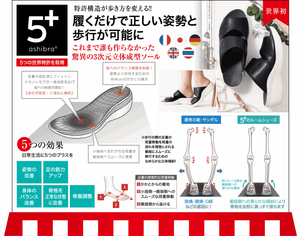 履くだけで美しい姿勢と歩行をサポートする健康シューズ。5つの効果で足元から身体全体をサポートします。体験・試着も可能ですので、健康を意識する方はぜひ一度お試しください。