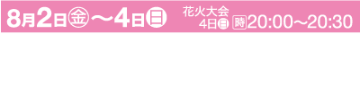 ピンクの背景に日本語の文字。白抜き文字で「8月8日(木)大阪高月・八幡宮筑紫境内 第69回高月天神花火大会 19:30~」とある。時刻の横に小さな時計アイコンがある。「高月」の後ろは右から左に書かれている。